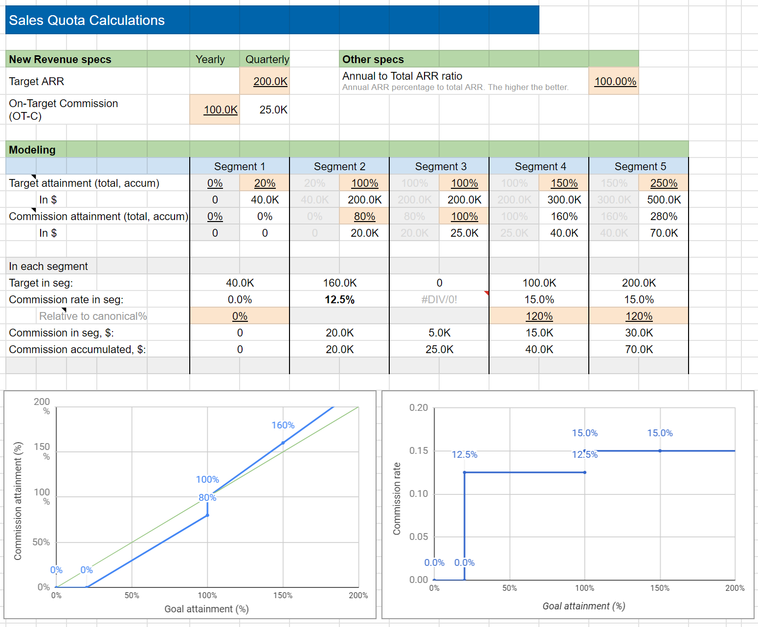 The simplest way to calculate commissions is with a rate. In the above example, between $40k and $200k, the sales rep receives a $20k commission, or they have a 20k / (200k-40k) = 12.5% base commission rate.